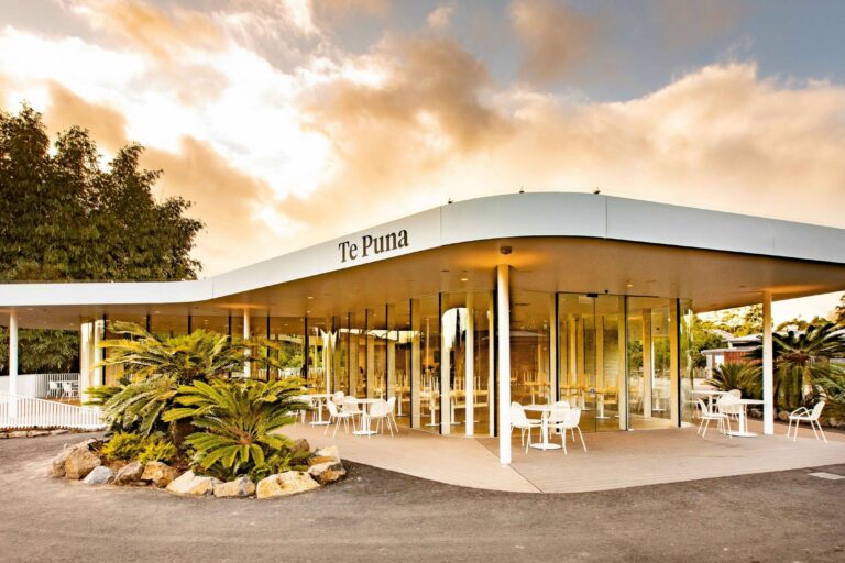 Auckland Zoo’s Te Puna Café was built to modernise food service to customers and provide a top-quality venue space. Overhanging the central lake and overlooking the High Canopy habitat, it provides a unique outlook where visitors can watch orangutans and siamangs swinging by.